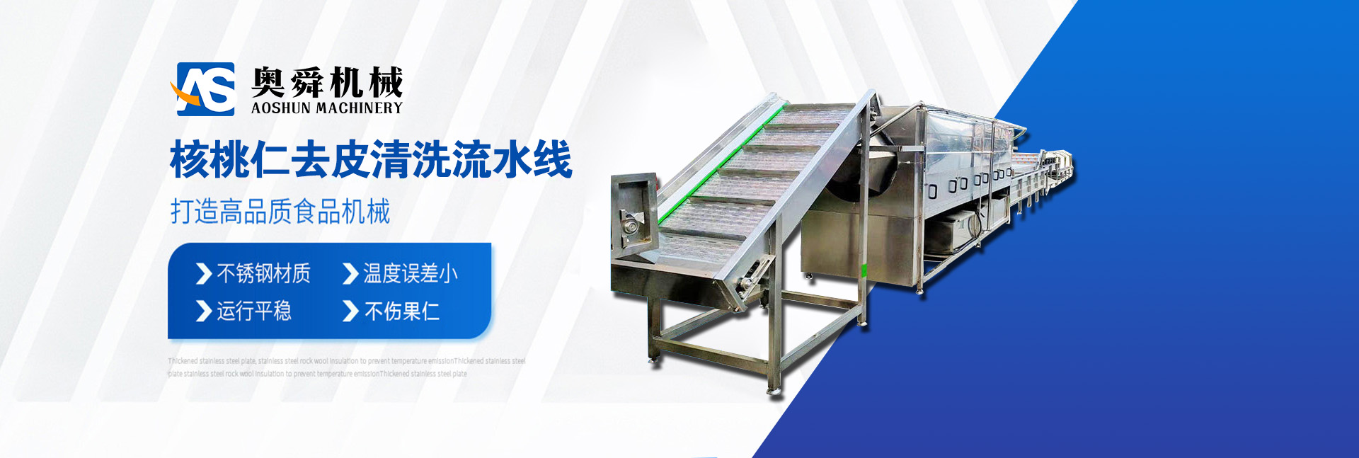 奧舜機械 【核桃仁去皮機】打破了核桃仁深加工過程中的困擾,純物理脫皮方法,專門針對核桃仁表皮的沖洗,代替了傳統(tǒng)的化學泡制去皮,使產(chǎn)品更安全放心,連續(xù)式工作,操作簡單,去皮率高、破損率低,自動化程度高,節(jié)省人工,可配套烘干箱使用。